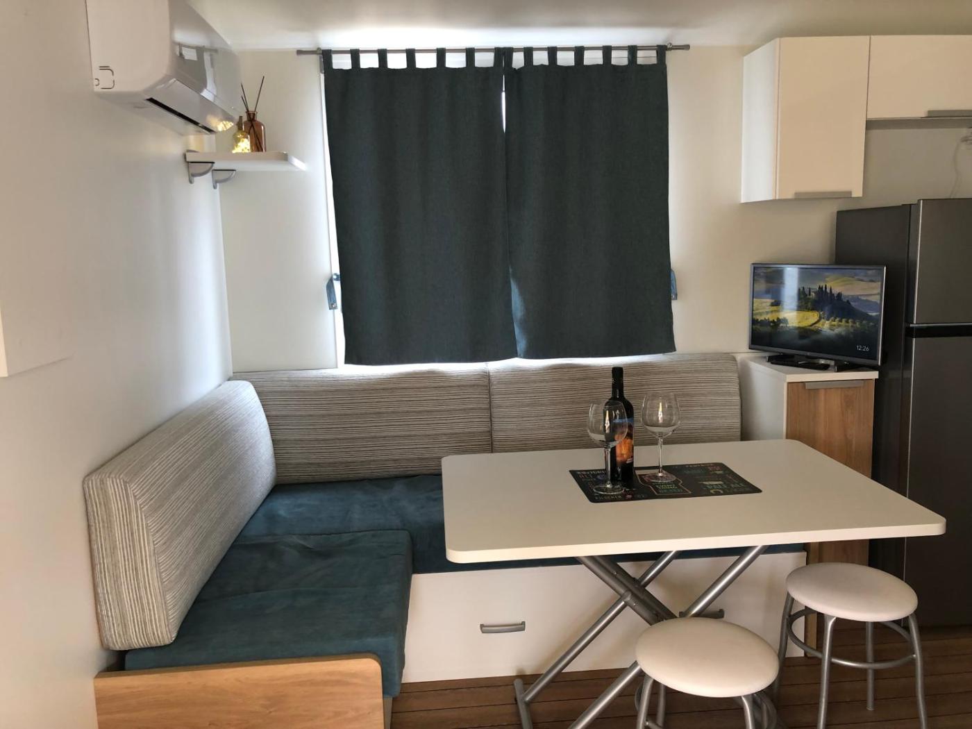 Mobile Home. This mobile home comprises 1 living room, 2 separate bedrooms and 1 bathroom with a shower and free toiletries. This mobile home is air-conditioned and features a seating area with a flat-screen TV, a tea and coffee maker, a dining area, a wardrobe, as well as a barbecue. The unit offers 5 beds.